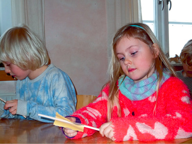 En af drengene kaster sig med stor iver over arbejdet, sliber ihærdigt den ene ende af pinden. Der virkelig bliver som en sommerfuglevinge. Men se, den er jo stadig helt ru i den anden ende, han må forholde sig til hele pinden, til at arbejdet helt bogstaveligt kan være langstrakt, han må bruge hele hånden og dreje den og sandpapiret samtidig. Han må være opmærksom på hele pinden. Hoved og hænder arbejder sammen, og han oplever, hvordan han må koncentrere sig om selve arbejdsprocessen.