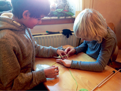 Når klassen begynder at strikke bliver det tydeligt, at det er sværere for nogle elever end for andre at få helt hold på finmotorikken. Begge hænder skal være i gang samtidig, de skal samarbejde, men ikke gøre det samme: den ene hånd skal holde styr både på pinden og den rette trådspænding på garnet, den anden skal danne den nye maske. Ingen af maskerne må falde af og alle skal strikkes. Det er svært, men samtidig en fælles sejr og en harmonisk og fortløbende proces, der passer godt til første klasse. Hele klassen strikker firkanter, der bliver til en hel flok af dværge; bagefter kommer dukkerne.